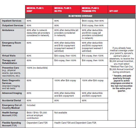 • Most team members can choose from three medical plan options: Medical plan 1: HDHP, Medical Plan 2: HD PPO, and Medical Plan 3: Premium PPO.